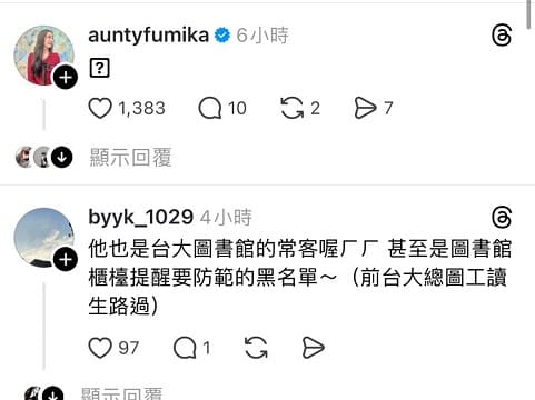 貼文下方更出現「優雅超人」本人留言「?」,引來網友回應「原踢來了」、「真正校友在這裡得斯~~」。此外,也有網友爆料該男子是台大圖書館常客,甚至曾被提醒要防範的黑名單,顯示他在校園內已有一定知名度。另有網友透露曾多次目擊曾婦出入圖書館,事件真相與背景更添神秘色彩。
