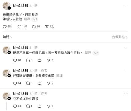 而在晚間社群上甚至有自稱靈媒的網友在社群發文寫到「孫德榮快死了,時間緊迫 誰趕快去救他」,他寫道「現場不是單一個體犯罪,是一整組勢力聯合行動。」、「呼吸斷斷續續,身體極度虛弱」,貼文底下一票網友焦急孫德榮狀況「他三小時前還有更新限時動態」,也有網友質疑真實性,對此該帳號則回應「哦對 我脾氣不好 就這樣 想告我 隨時來」。