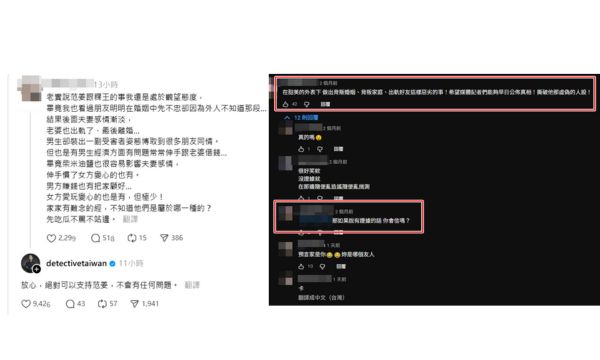 此外,徵信執行長謝智博9月曾在節目中提到類似案件,雖未公開當事人姓名,但線索與范姜、粿粿、王子高度吻合。當時謝智博表示,男方(范姜)最害怕談判過程被媒體渲染,對小王(王子)的抨擊力度也有限,並透露夫妻確定離婚原因:「女生對老公完全沒尊重」。他強調支持范姜,並表示案件涉及演藝圈,離婚賠償金有望達3000萬。