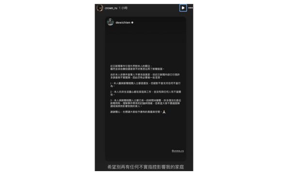簡廷芮的丈夫賴冠儒也同步轉發該聲明,寫下17字:「希望別再有任何不實指控影響我的家庭」,展現力挺妻子的態度。