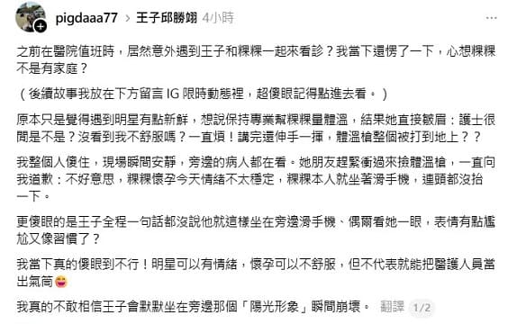該護理師聲稱自己原先遇到粿粿覺得很新鮮,他也盡量保持專業幫粿粿量體溫,結果粿粿卻皺眉說到「護士很閒是不是?沒看到我不舒服嗎?一直煩!」,講完後粿粿還伸手一揮,直接將體溫槍打到地上,護理師表示「我整個人傻住,現場瞬間安靜,旁邊的病人都在看。她朋友趕緊衝過來撿體溫槍,一直向我道歉,並解釋粿粿因為懷孕情緒不穩定,而在當下粿粿本人就坐著滑手機,連頭都沒抬一下「更傻眼的是王子全程一句話都沒說他就這樣坐在旁邊滑手機、偶爾看她一眼,表情有點尷尬又像習慣了?」
