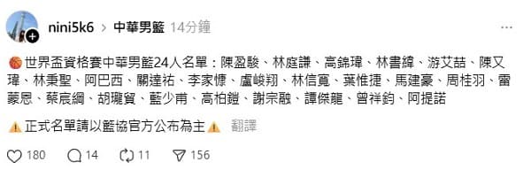 世界盃籃球資格賽將於11月28日正式開打,中華隊最新24人名單也提前曝光。