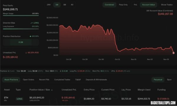 根據《ZOMBIT》報導,鏈上數據顯示,黃立成持有的以太幣(ETH)與 HYPE 多單在今日中午再度遭到部分清算,實現虧損約13.5萬美元。此外,他在強制平倉前後主動平倉約3.3萬顆 HYPE 多單,額外虧損達10.8萬美元。目前帳戶中仍持有約1,632 顆以太幣多單,浮虧約23.5萬美元,強平價格落在3,723美元。