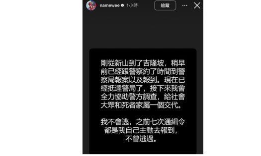 剛從新山到了吉隆坡,稍早前已經跟警察約了時間到警察局報案以及報到。現在已經抵達警局了,接下來我會全力協助警方調查,給社會大眾和死者家屬一個交代。