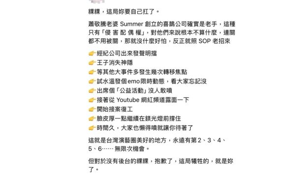 該名網友更羅列出一套被戲稱為「演藝圈復出SOP」的九步驟:經紀公司先出面擋風頭、本人短暫神隱、等新話題轉移焦點、再以emo文測試輿論、出席公益活動洗形象、之後在YouTube露面試水溫,最後再逐步接案復工。原PO直言:「台灣演藝圈永遠有第2、3、4、5次機會,但沒後台的粿粿,只能被犧牲。」
