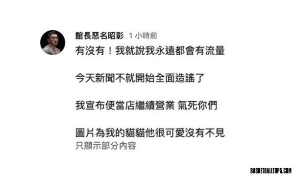 館長陳之漢表示,自己「永遠都有流量」,強調便當店續營運就是要氣死酸民,並在貼文中附上自家寵物貓照片,語氣戲謔不減。True飯粉專則補充:「我們結束營業,我們又開始營業惹」,稱看到粉絲捨不得,館長「於心不忍」,因此決定持續經營並推出新菜色。