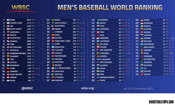 WBSC世界棒壘球總會公布最新世界排名,中華隊以總分5112分穩居世界第2,日本仍以6676分居冠,美國則排名第3。前六名依序為日本、台灣、美國、韓國、委內瑞拉與墨西哥。而中國隊表現顯著進步,本次排名上升2位至第17名,積分突破千分大關,達1136分。