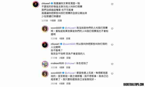 貼文底下,秋偉回應建議孫生將文章寫清楚,不要讓人誤解為主辦方找人叫他打假賽,並要求「把那些叫你打假賽的全部公開出來」。孫生則澄清,「我沒說是你們的人叫我打假賽,重點是如果就算是你們的人叫我打假賽,我也不會知道。」秋偉再度回應表示,「所以我叫你把那些叫你打假的人公開啊,你不敢嗎?我完全不怕啊,因為不會是我的人。」孫生則說,「都是些道上兄弟,每個都見面說的,甚至都是一面之緣,我不想惹事,我自己已經很累了,我只要知道自己沒答應就好。」