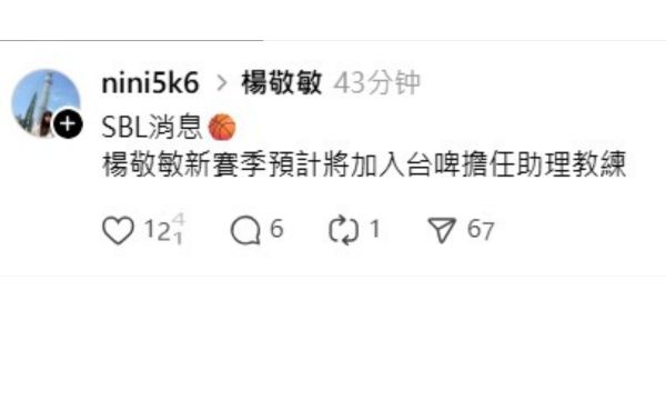 根據知名記者倪芝蓉爆料,楊敬敏新賽季預計加入SBL台啤隊,擔任助理教練,正式重返籃壇。