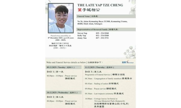 馬來西亞童星葉子誠近日傳出噩耗,家屬透過臉書公告,透露他已於昨日(12月8日)安詳離世,享年25歲,將長眠於富貴山莊(士毛月)風景墓園,告別式預計於12月11日舉行。