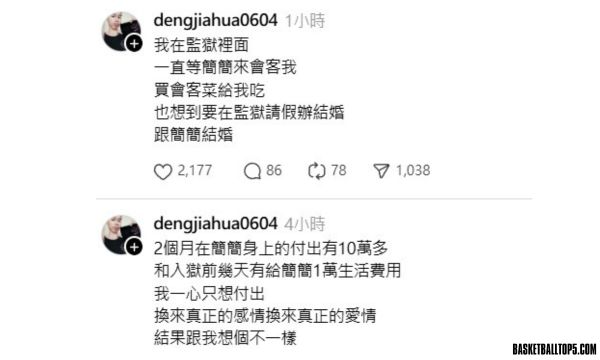 鄧佳華在社群平台回顧入獄期間的生活,透露與前女友簡簡的相處經過。他表示,入獄期間曾期盼簡簡前來會客,並為她準備會客菜,希望在獄中辦理請假結婚手續。