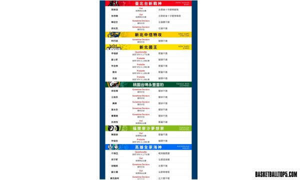 桃園台啤永豐雲豹:呈現大規模「賽前決定(Gametime Decision)」狀態,包含徐宏瑋、王皓吉等多名主力,教練團可能需等到開賽前最後一刻才能確定陣容。
