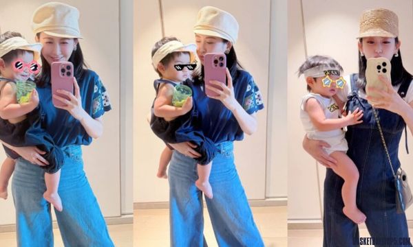 在曝光的照片中,愷樂穿著簡約的白色短袖上衣、藍色牛仔寬褲,並頭戴米色帽子遮住部分妝容,打扮十分清新、生活化。她單手抱著兒子,另一手拿起手機對鏡自拍,不僅展現了俐落的育兒架勢,更對著鏡頭露出招牌的甜美酒窩。