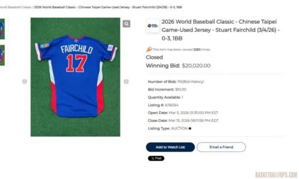 這件寫下 2026 WBC 紀念品標竿的球衣,自 3 月 5 日上架後就成為全球收藏家焦點。雖然費爾柴德當天數據並不出色,僅靠保送上壘,但其大聯盟外野手的身分與在中華隊的超高人氣,讓這件沾過汗水的「實戰品」價值連城。結標前夕加價過程極其慘烈,最終以破 2 萬美金結標,傲視所有中華隊球員。