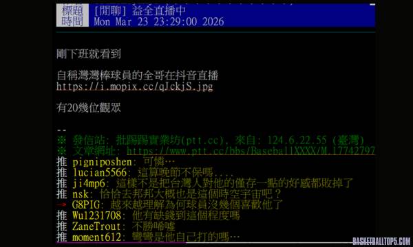 討論區也開始質疑林益全是否面臨財務危機,紛紛表示:「富邦當初給的薪水不少吧,有這麼缺錢嗎?」、「20 幾個人看,能賺什麼錢?」昔日全台知名的重砲手,如今卻在對岸平台以「彎彎」自居拚流量,讓老球迷感到不勝唏噓。
