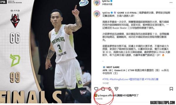 昨日(18日)於 TPBL 賽場,台中夢想家以 99:66 的懸殊比分大勝台北台新戰神。隨後有眼尖網友發現,在該場比賽的相關社群貼文下,PLG 官方帳號竟然公開點讚。